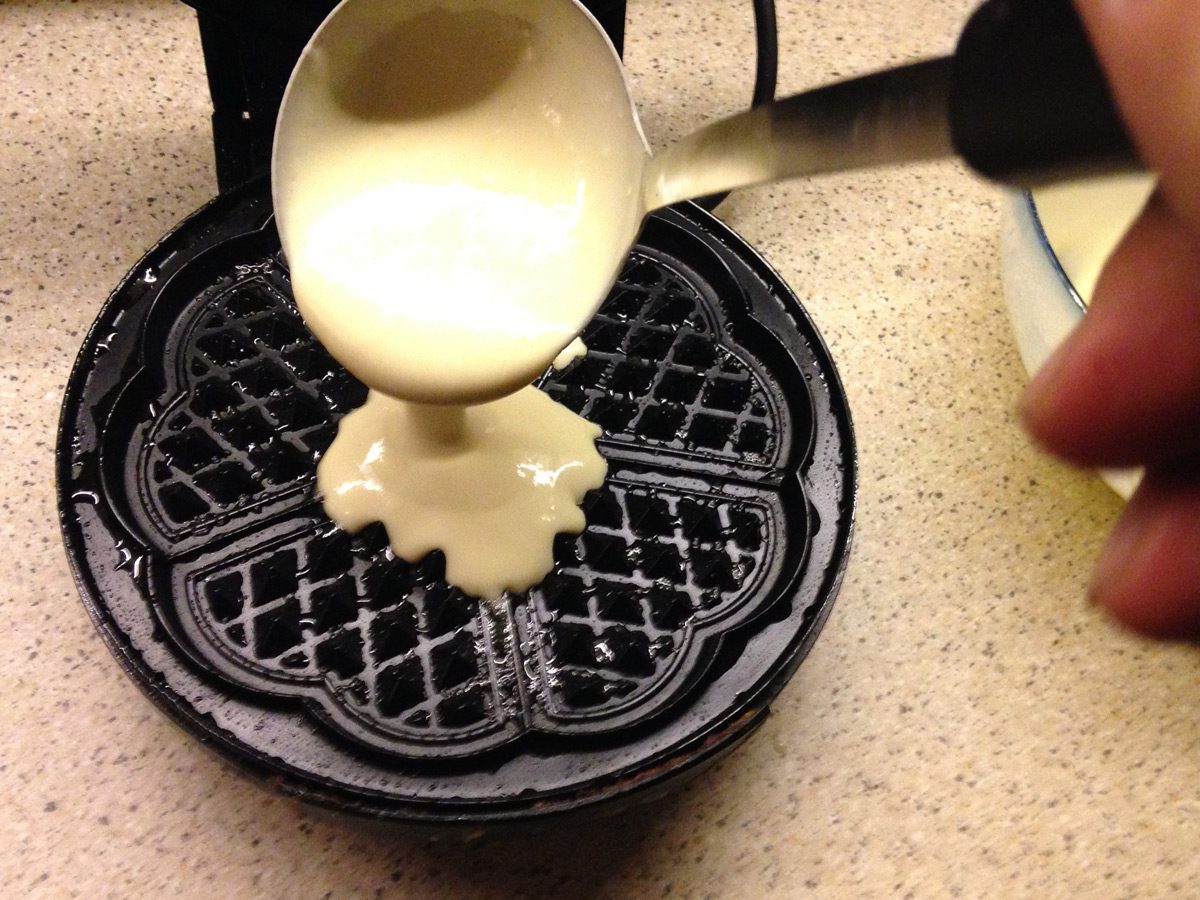 8-10 dakika kadar beklemiş karışımı, kızgın makinaya, makinanın içini kaplıyacak şekilde dökün. Burada çok fazla hamur koymayın çünkü pişerken kabaracağı için kapağı açabilir.
