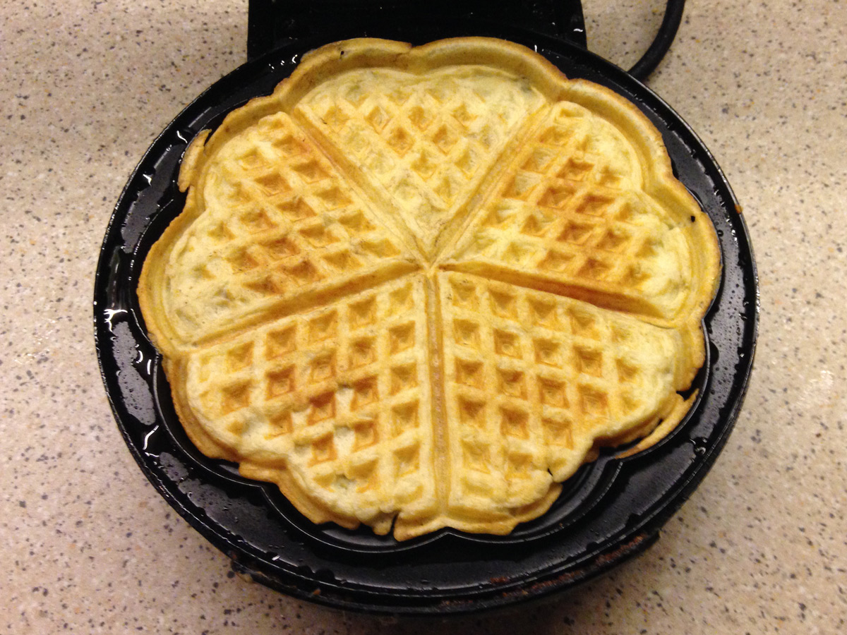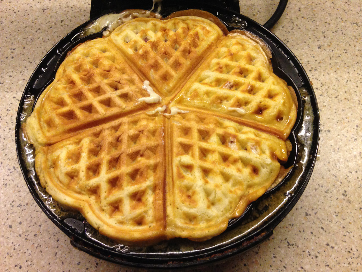 Burda pişen waffle’leri, hamur buhar çıkardığı için terleme yapıp yumuşamasın diye tel üzerinde bekletiyorum.