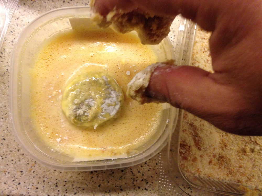 Donmuş soğan halkasındaki avokado karışımımızı daha sonra sırasıyla önce una, sonra yumurtaya, sonra galeta ununa / ekmek kırıntısına, tekrar yumurta ve tekrar galeta ununa / ekmek kırıntısına batırıp bir tepside birbirine değmeden biriktirin. Ama acele edin. Donmuş avokadolar erimesin.