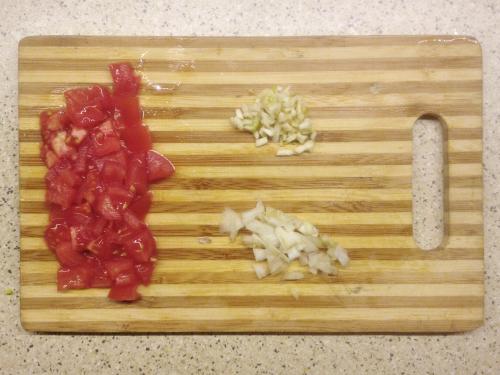 Hazırladığımız bu dolgu malzemesini lezzetlendirelim biraz… Bir domatesi küp küp keselim. Sarımsakları ufacık ufacık çimtelim. Soğanı halka halka keselim ve en küçük parçalarını parçalayıp iç harcı yapalım.